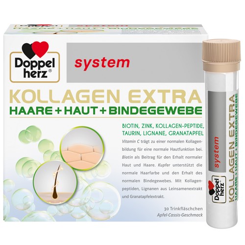 Doppelherz system enthält eine Kombination aus ausgesuchten Nährstoffen für Haut, Haare und Bindegewebe im praktischen Trinkfläschchen. Sofort trinkfertig mit leckerem Apfel-Cassis-Geschmack enthalten die Trinkfläschchen Vitamin A, Vitamin E, Vitamin C und Biotin sowie die Spurenelemente Zink und Kupfer. Zusätzlich enthalten sind 2,5 g Kollagen-Peptide, Lignane aus Leinsamenextrakt, Granatapfelextrakt und Taurin. Schöne Haut und Haare sowie ein festes Bindegewebe entsprechen dem heutigen Schönheitsideal und gehören für viele zu einem gepflegten Aussehen dazu. Sie erbringen durch Erneuerung und Wachstum täglich Höchstleistungen und benötigen hierfür Nährstoffe. Eine regelmäßige Zufuhr von Vitaminen und Mineralstoffen kann dabei helfen, die natürliche Schönheit von innen zu unterstützen.