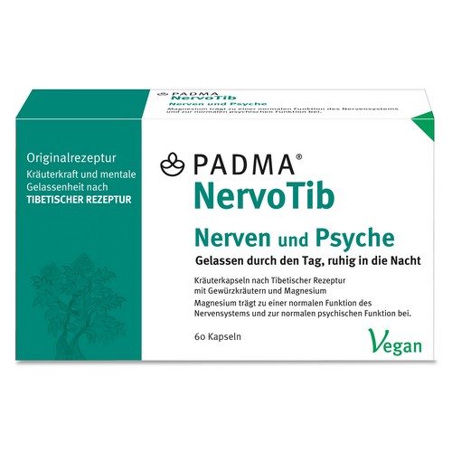 Inhaltsstoffe PADMA NervoTib pro Tagesportion (zu 4 Kapseln): Kümmel 240 mg, entsteinte Myrobalanenfrüchte 160 mg, Süßholzwurzel 160 mg, Muskatnuss 160 mg, Gewürznelken 120 mg, Alantwurzel 120 mg, Sichuanpfefferfruchtwand 120 mg, Magnesiumoxid 120 mg, Bockshornsamen 112 mg, Indischer Weihrauch 80 mg, Asafoetida 48 mg.